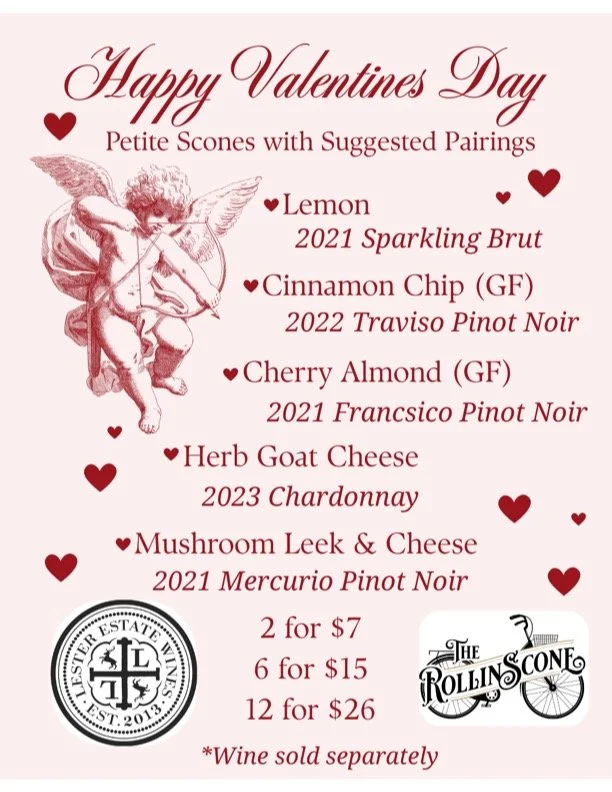 Join us on Valentine's Day for an afternoon filled with wine, scones and good company! We’ll be offering a variety of sweet and savory homemade scones, alongside suggested wine pairings curated to complement every bite.